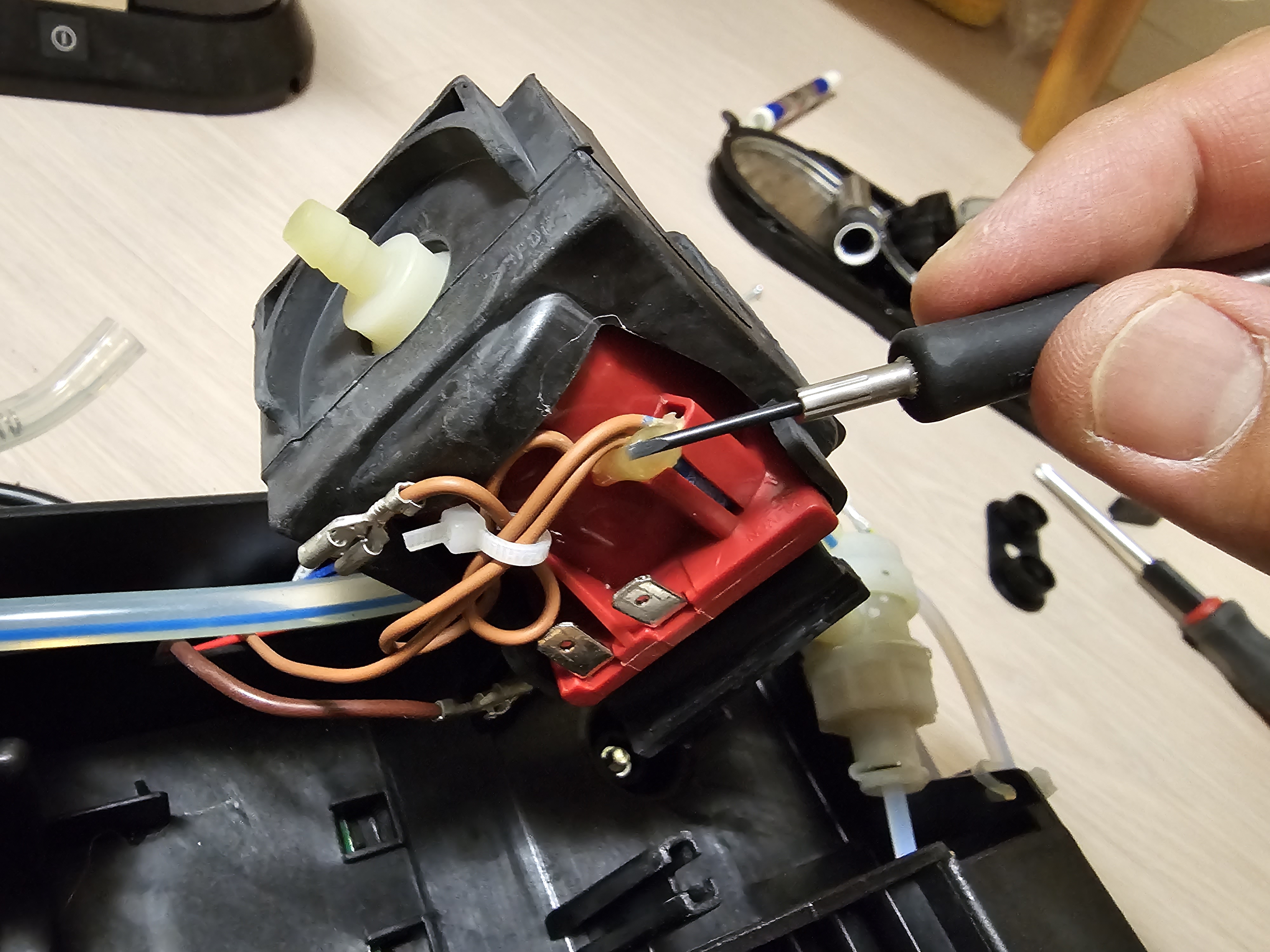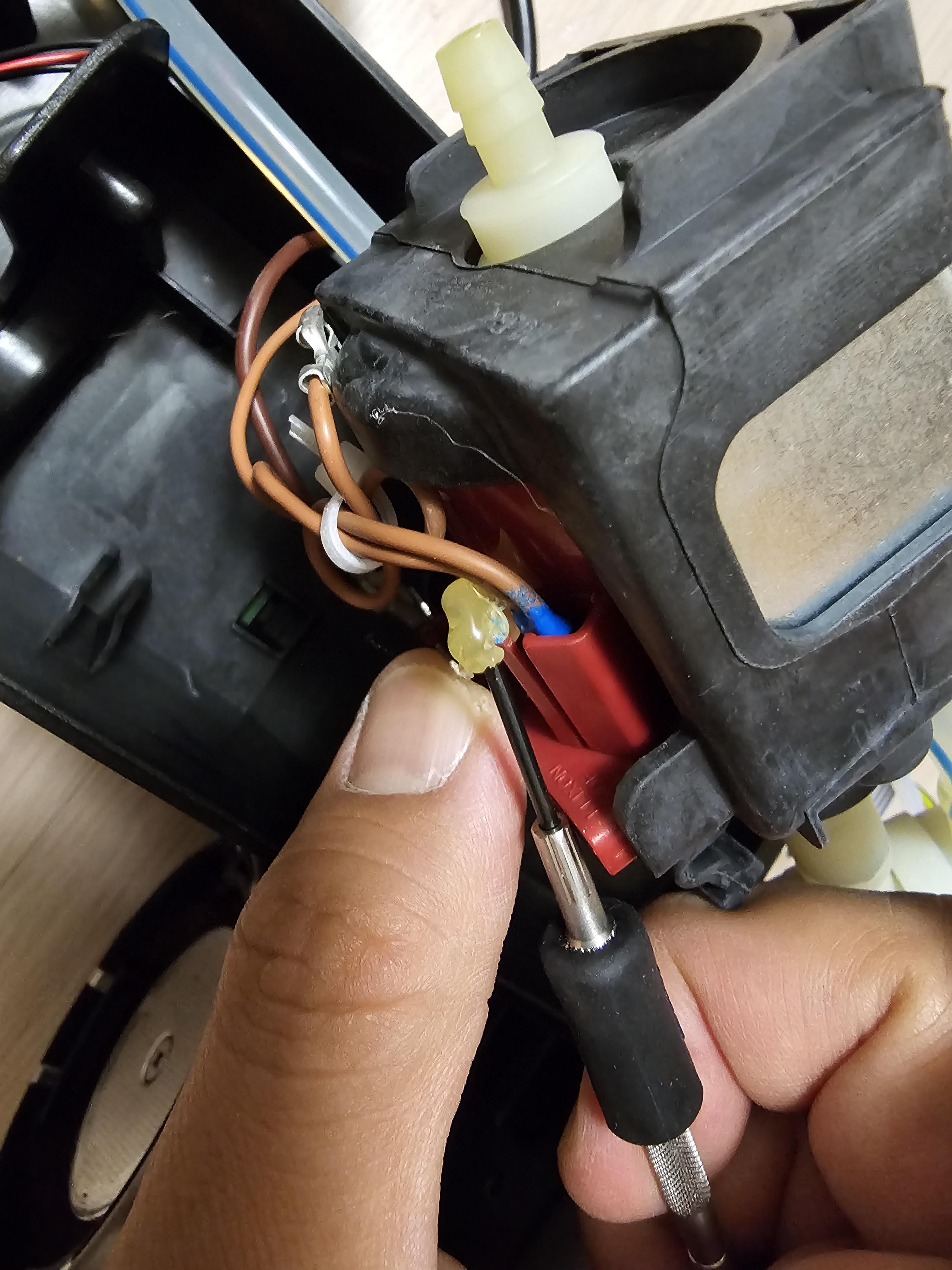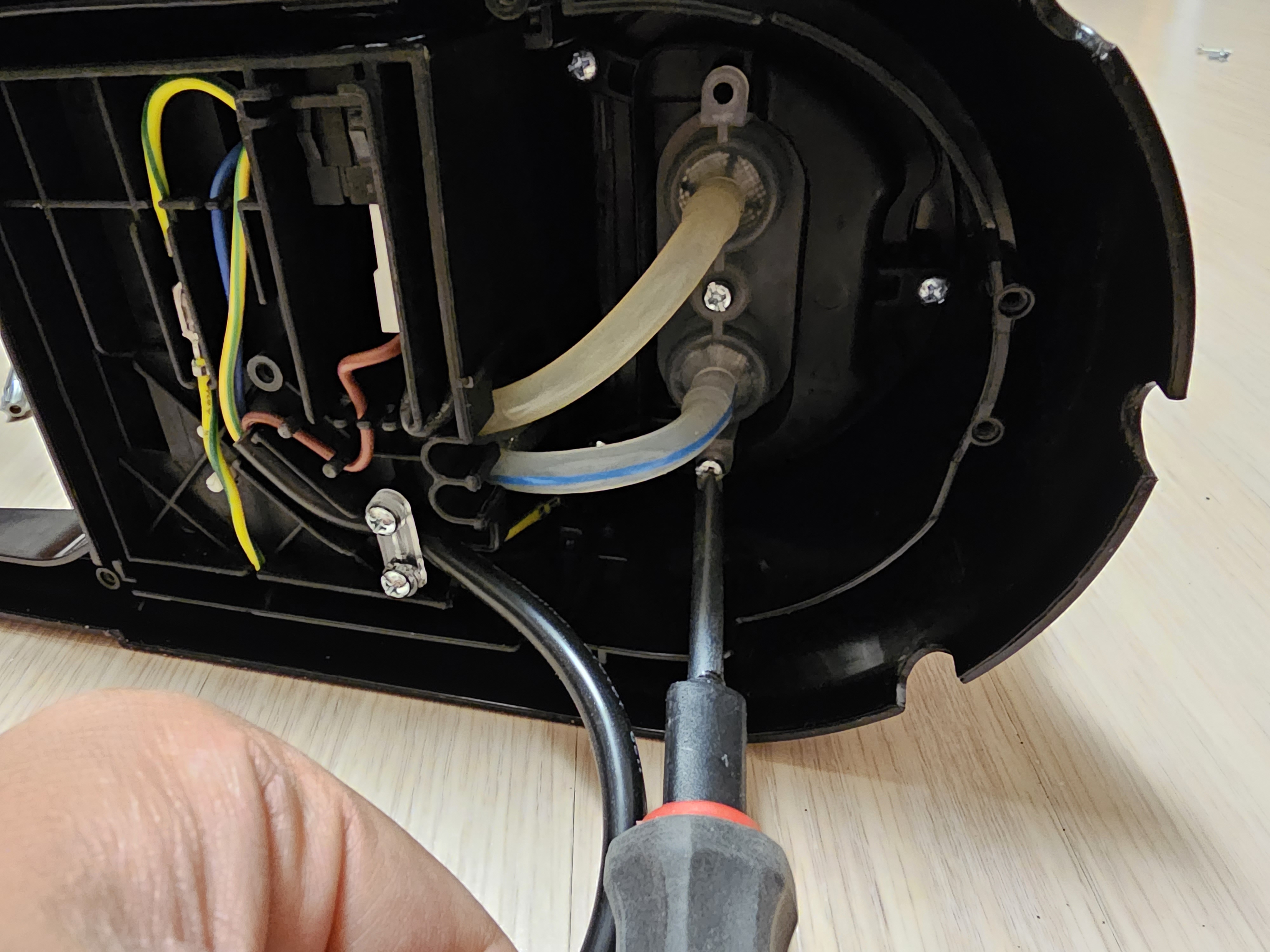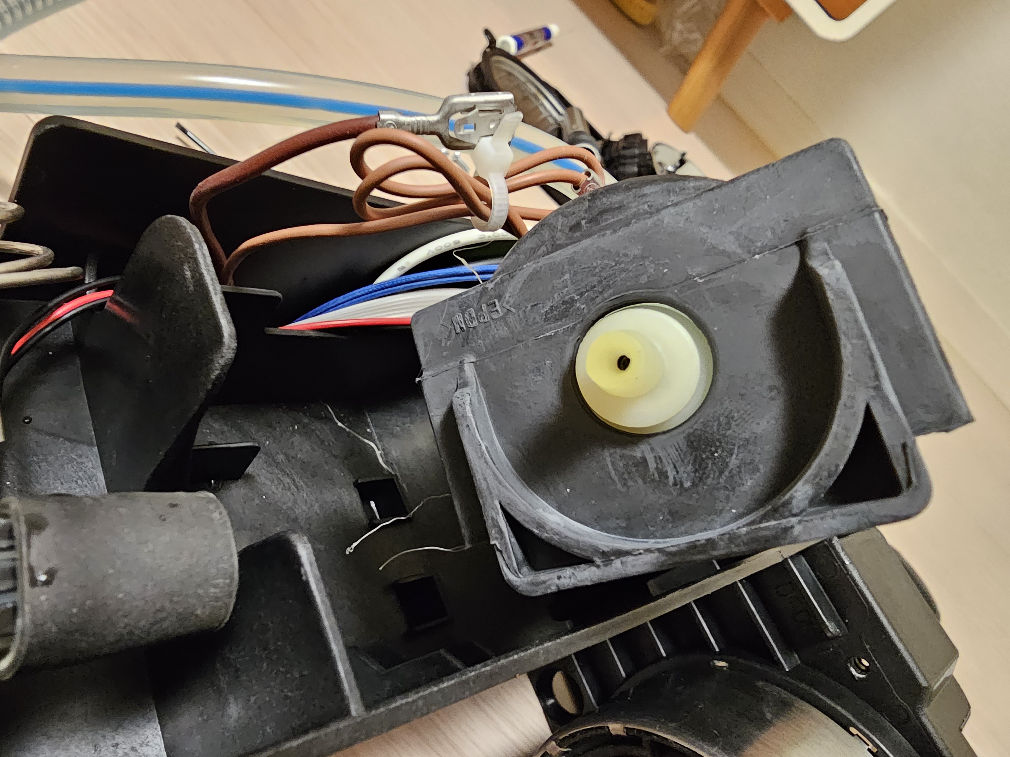 펜치로 상단부에 고정되어있는 클립을 먼저 제거해준다. 물이 순환하는 상황에서 기계 내부에 조금이라도 물이 새면 안되니 아주 단단하게 고정되어 있다. 펜치가 필요한 이유이다.