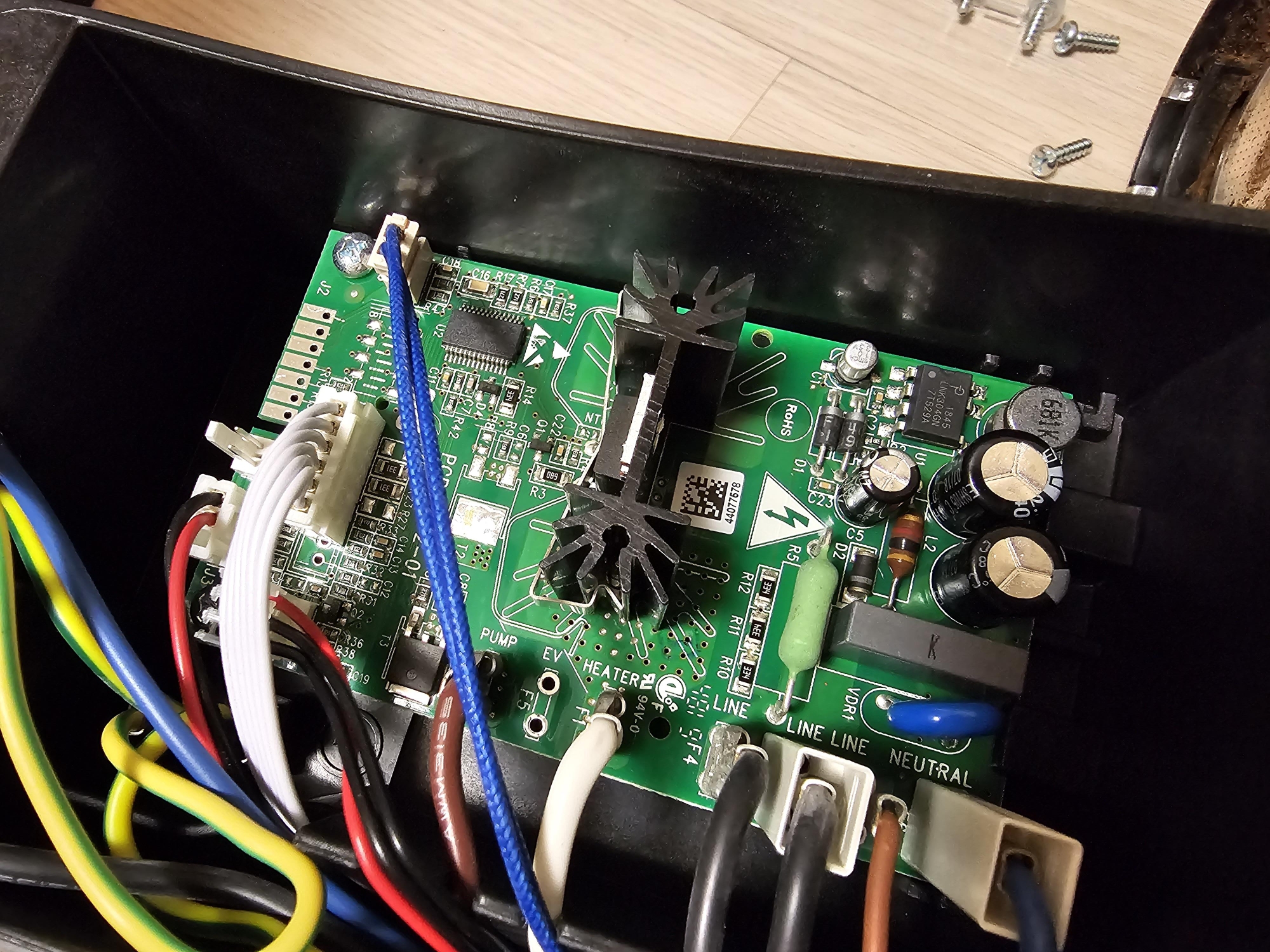 기판도 한번 봐주고. 각종 파트로 연결되는 페리페럴들과 파워케이블들이 보인다. PUMP / HEATER / LINE / LINE / NEUTRAL등의 글자개 보이는가. 그리고 온도나 시간 물량등을 컨트롤할 것으로 예상되는 MCU가 가운데 보인다.