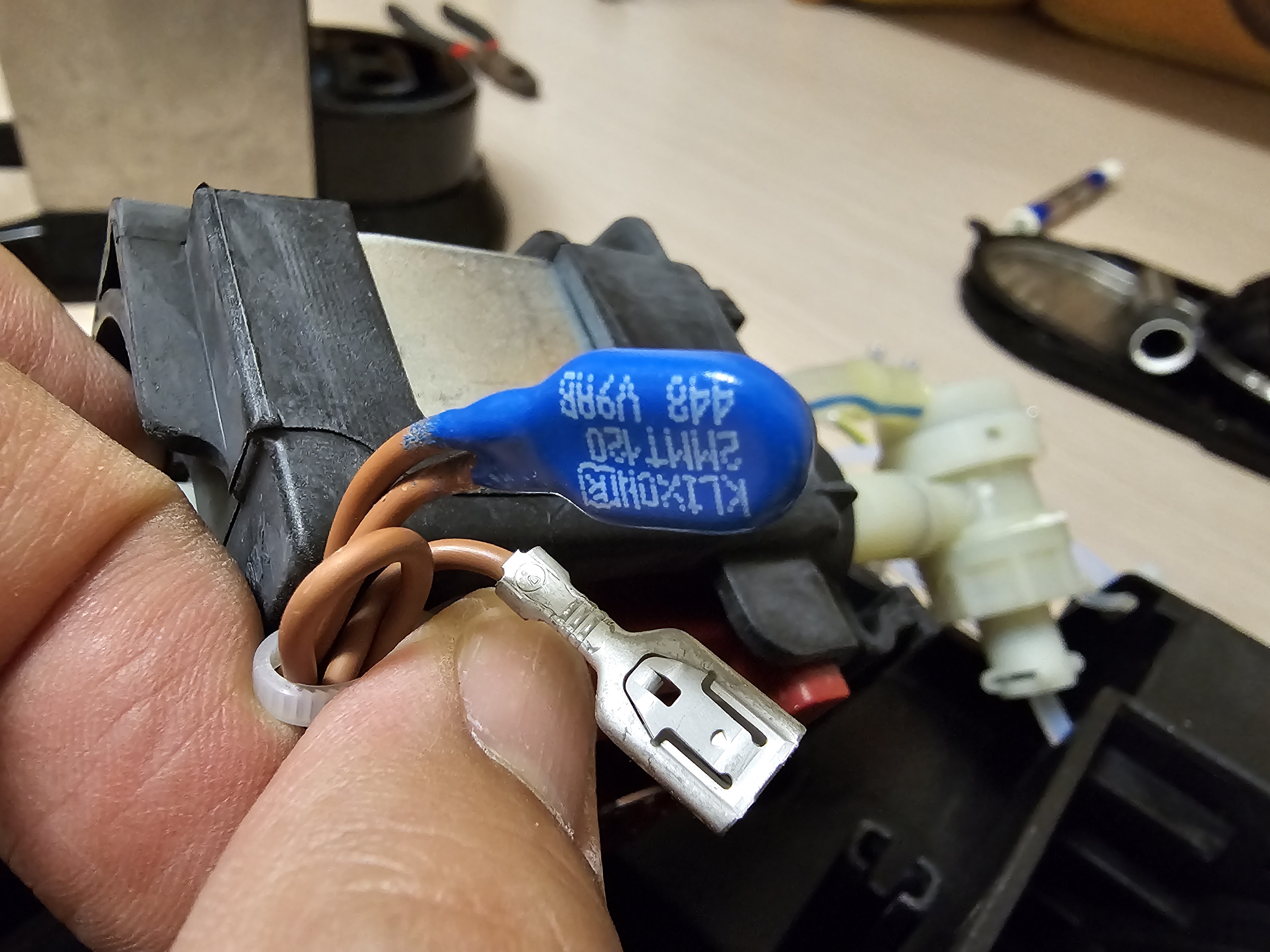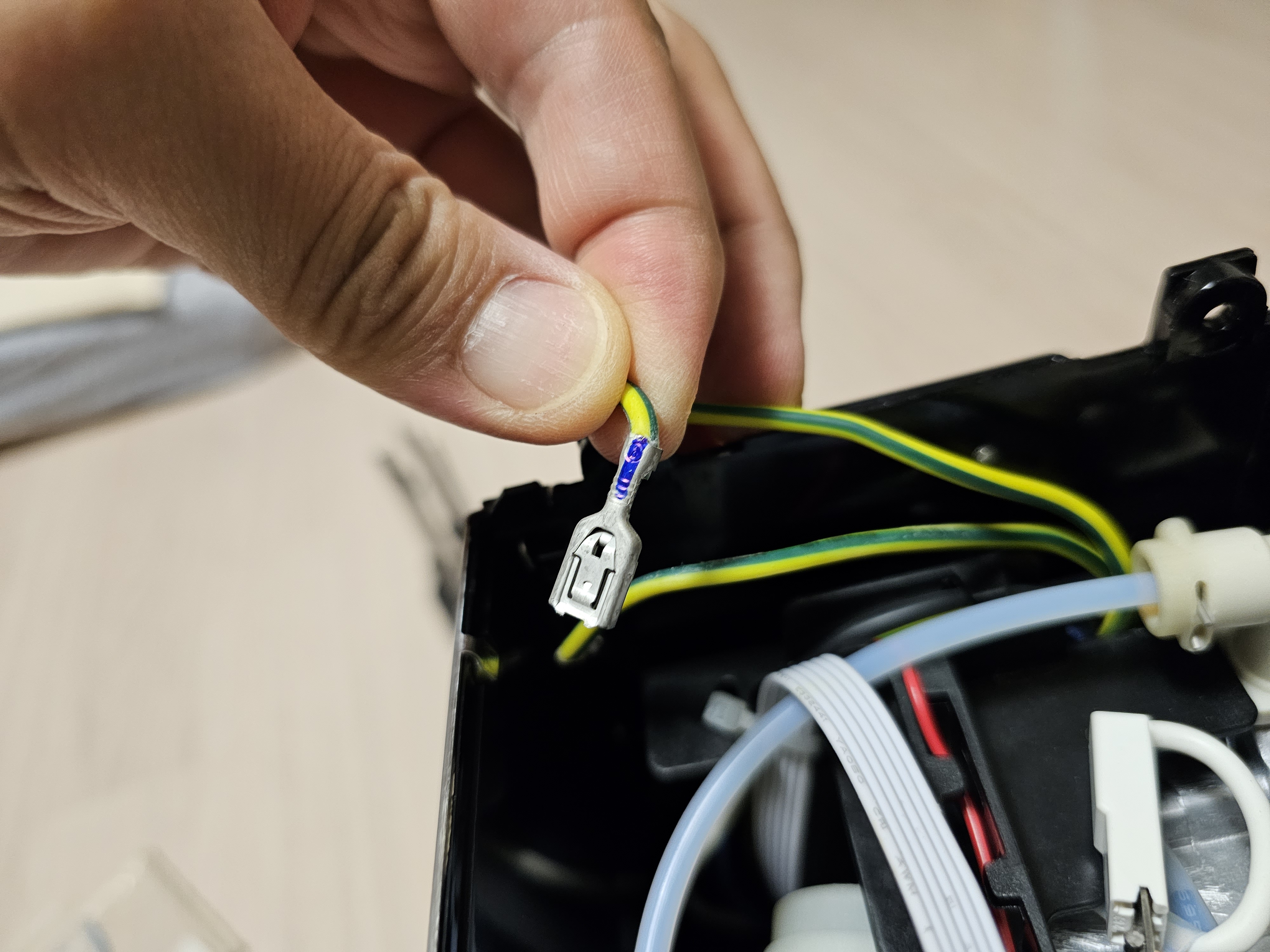 상단 히팅패널에 전원 공급용으로 세로로 길게 뻗어있는 이 케이블도 임시로 분리해준다. 다른 케이블과 헷갈리지 않게 유성매직으로 표시를 해두었다.