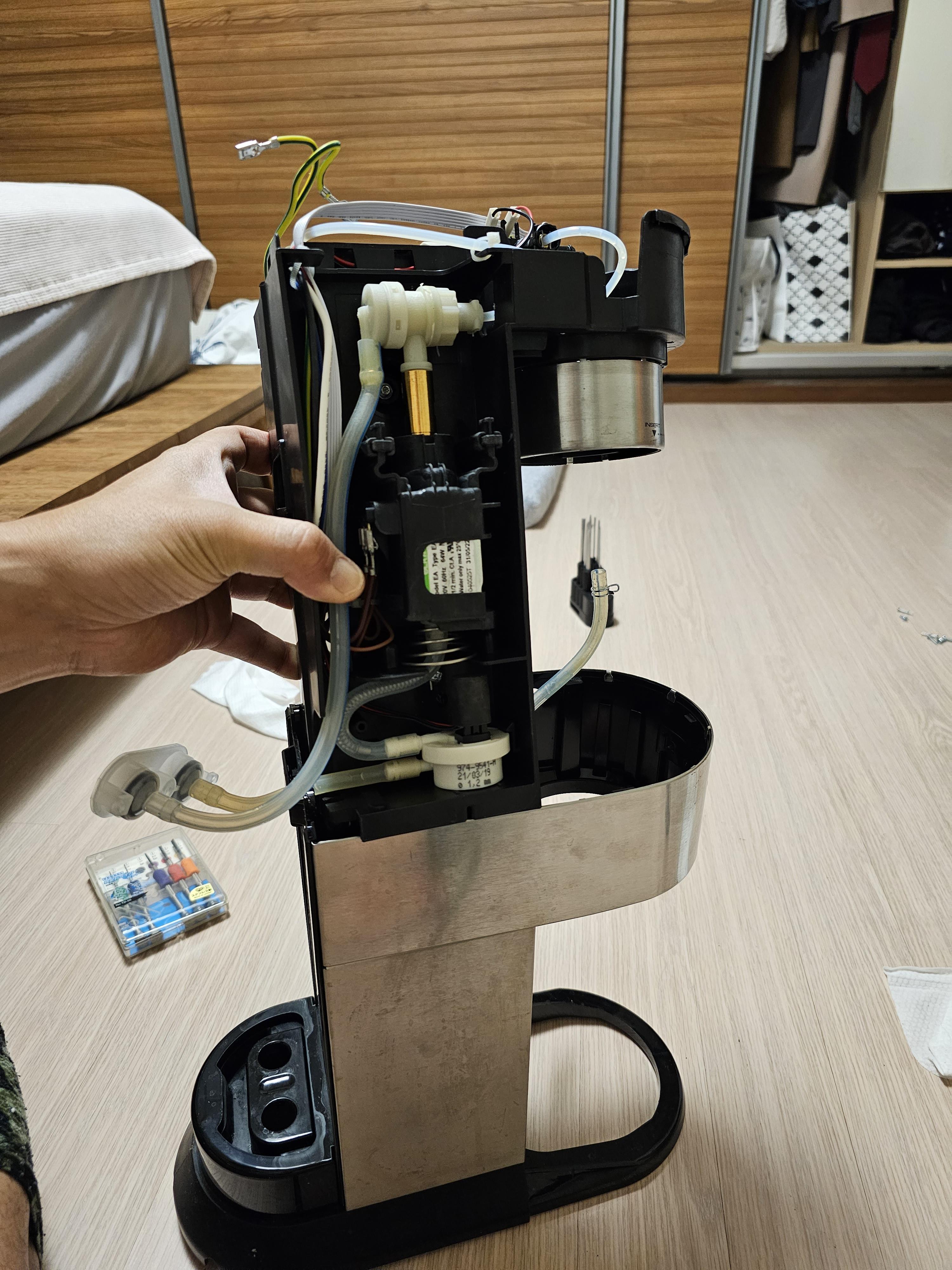 누님댁에 커피머신을 새로 들였는데 이 모델의 펌프가 50HZ 라 60HZ인 국내주파수용 펌프로 바꾸면 훨씬 성능이 업그레이드된다고 교체를 부탁받았습니다. 펌프를 주문하고 공구를 준비해서 분해