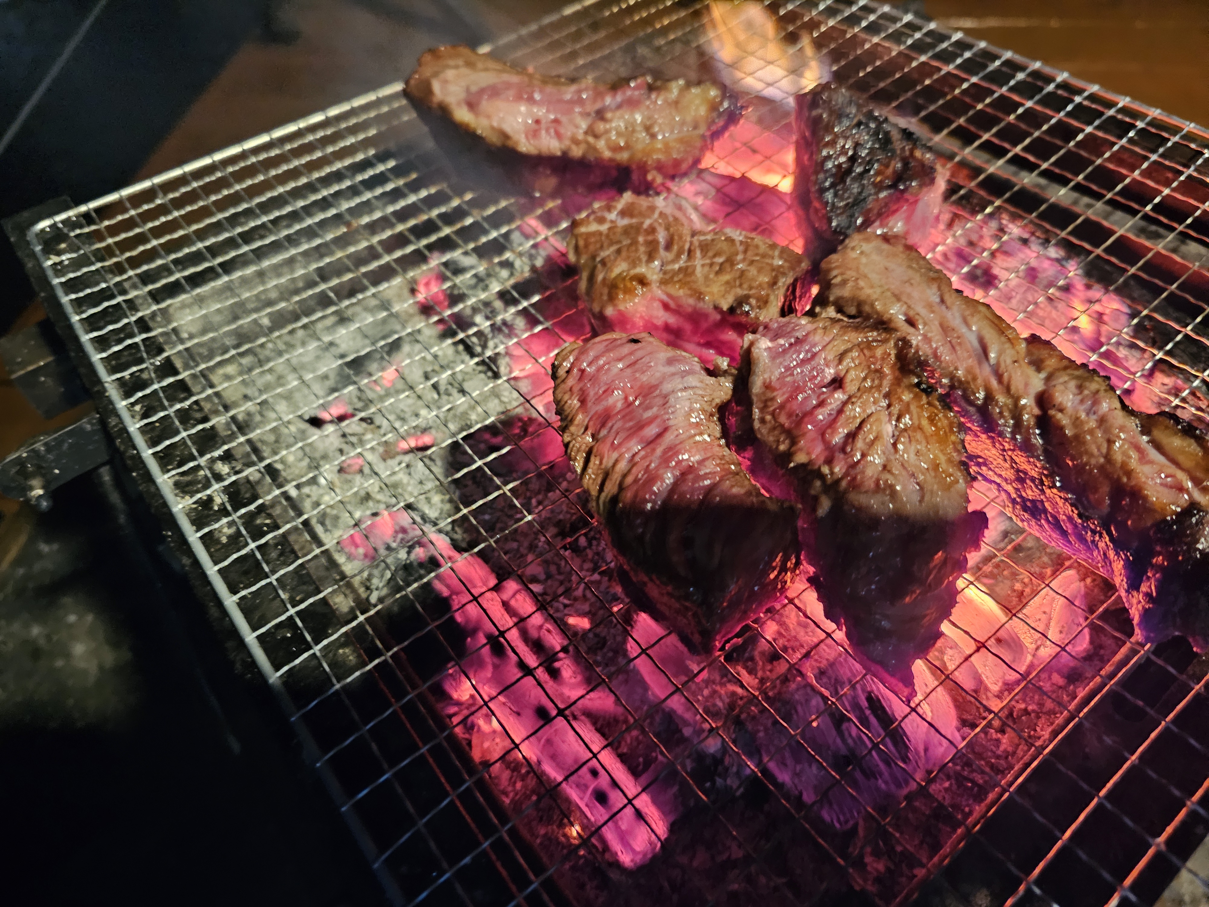 붉은 숯 위에 고기를 올리니, 그 냄새가 단숨에 하루의 피로를 지웠다.
