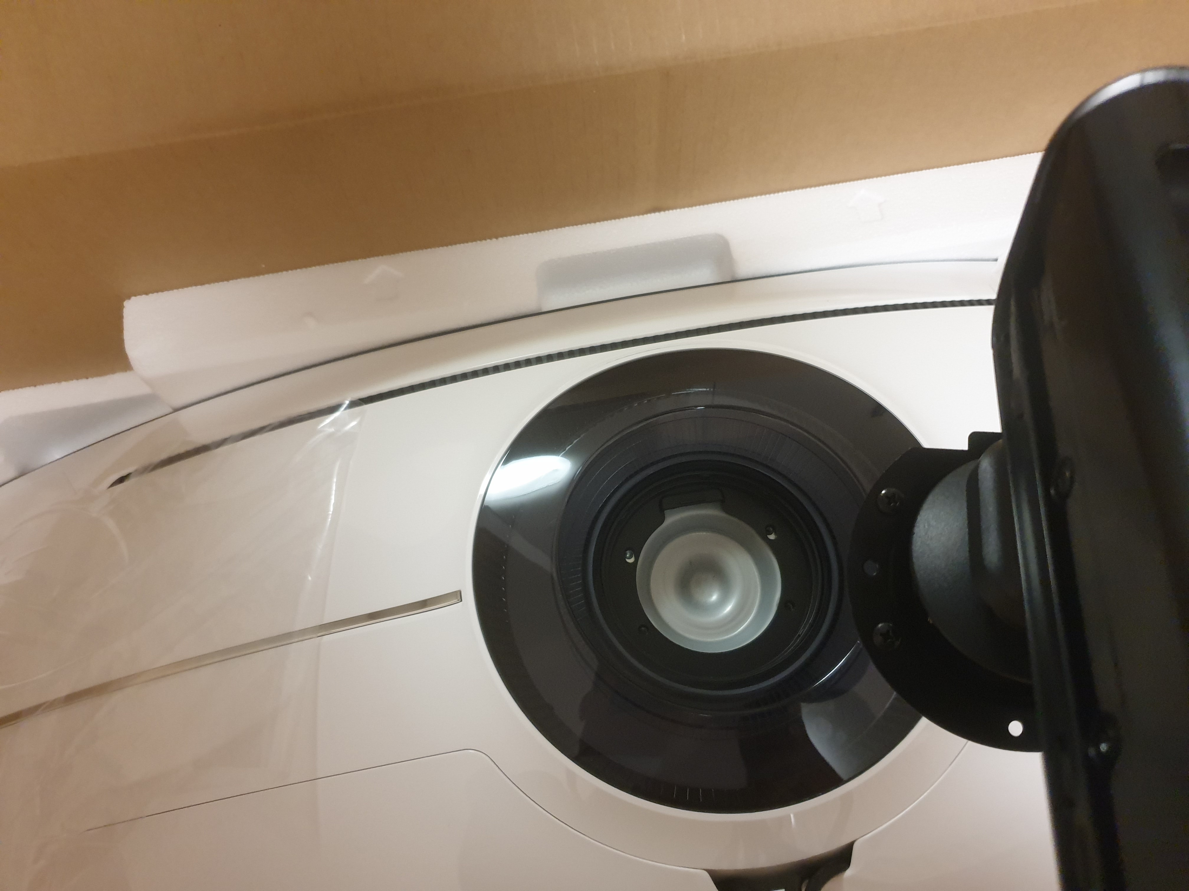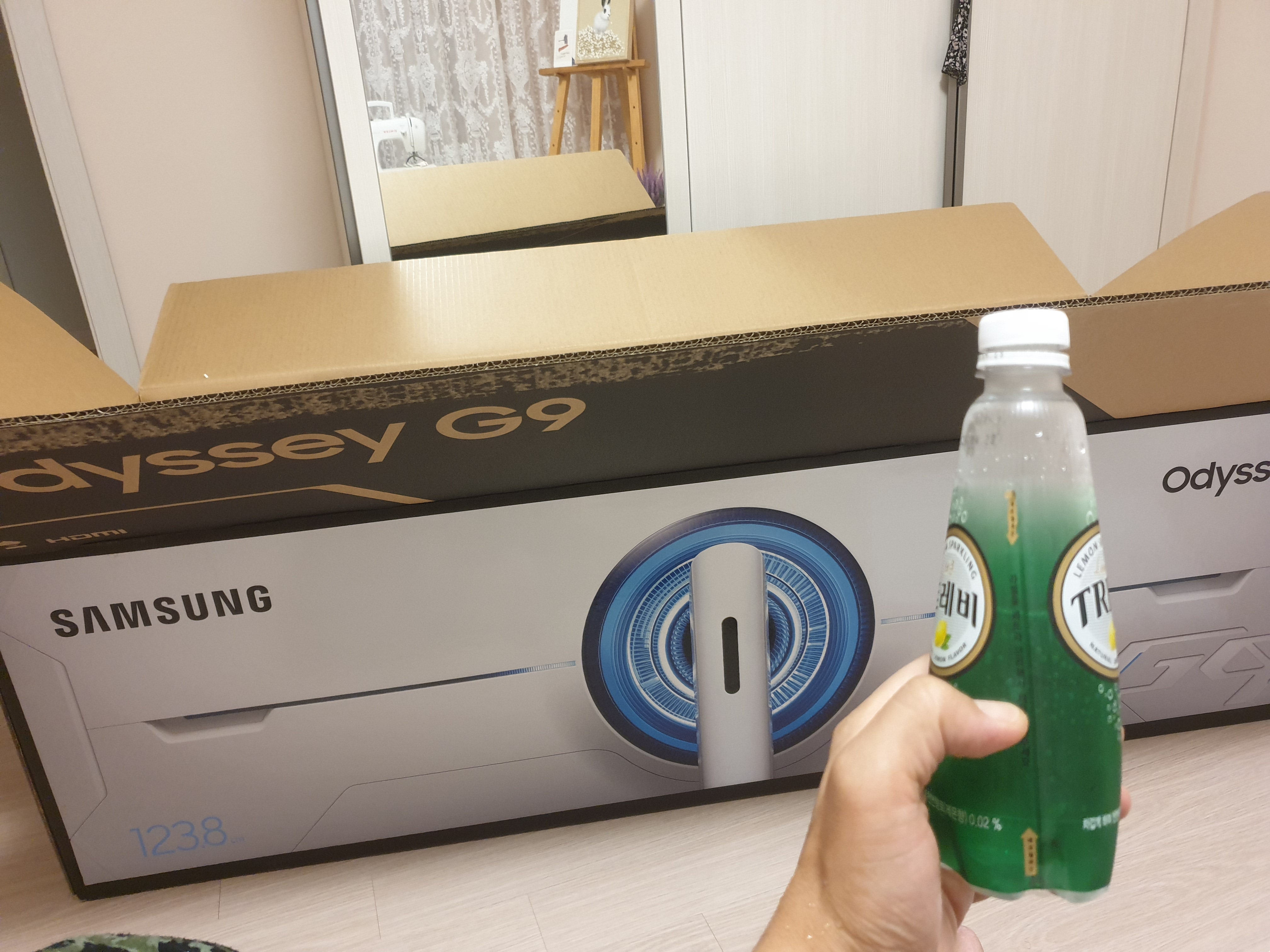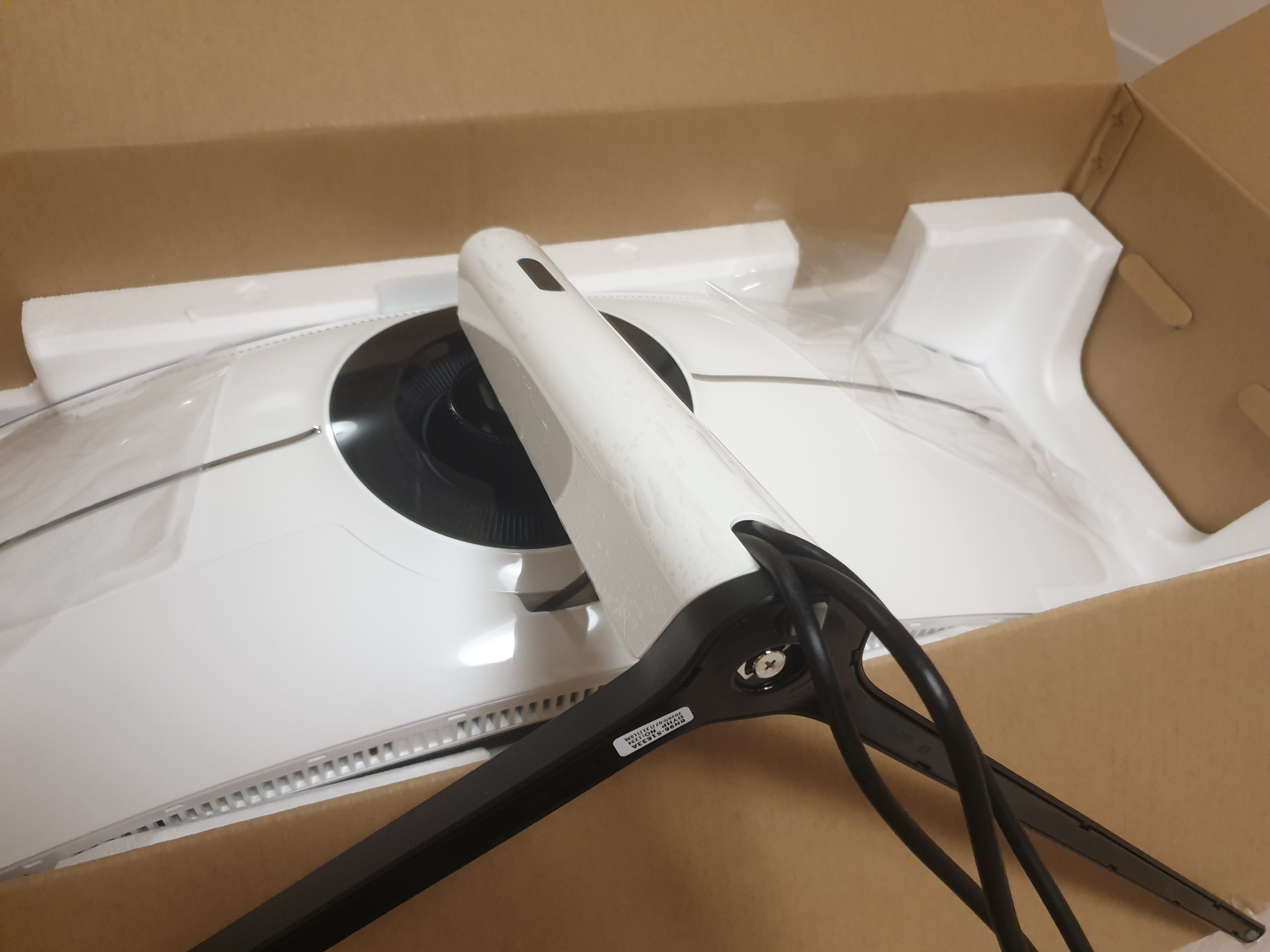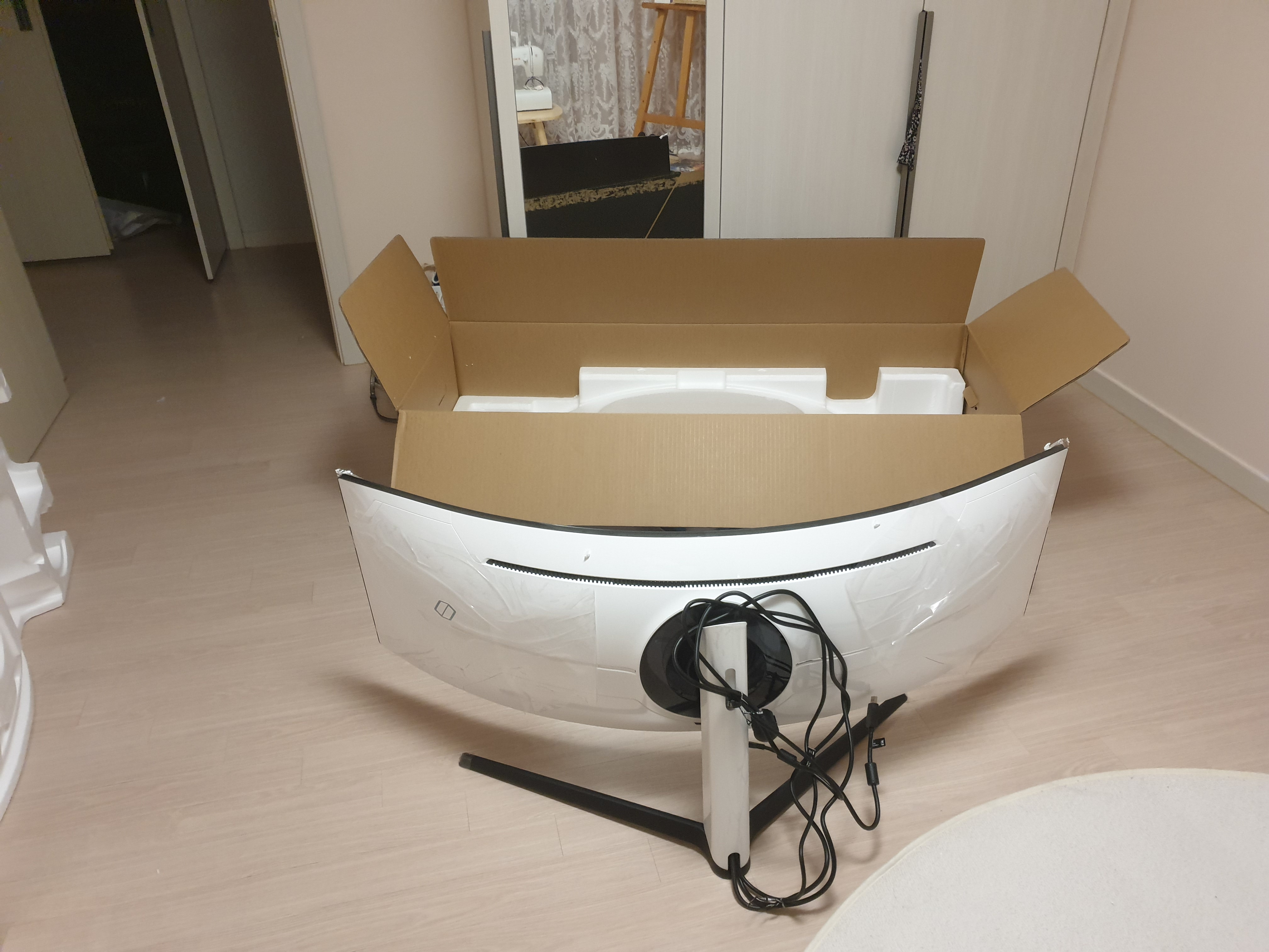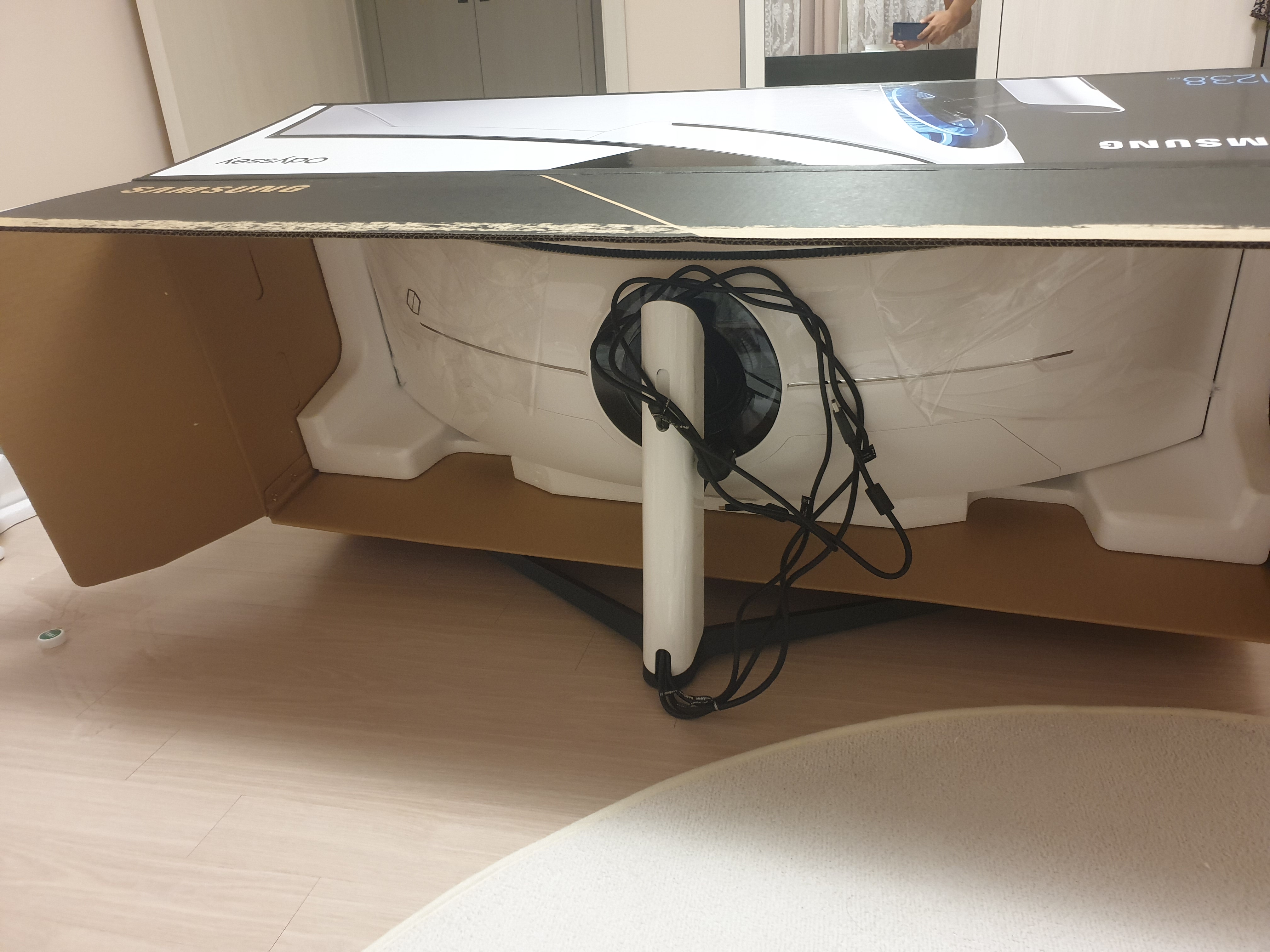 본체는 박스에 그대로 둔채로 스탠드와 케이블을 장착해준 모습이다. 이제 스탠드를 이용해 박스를 세운다.