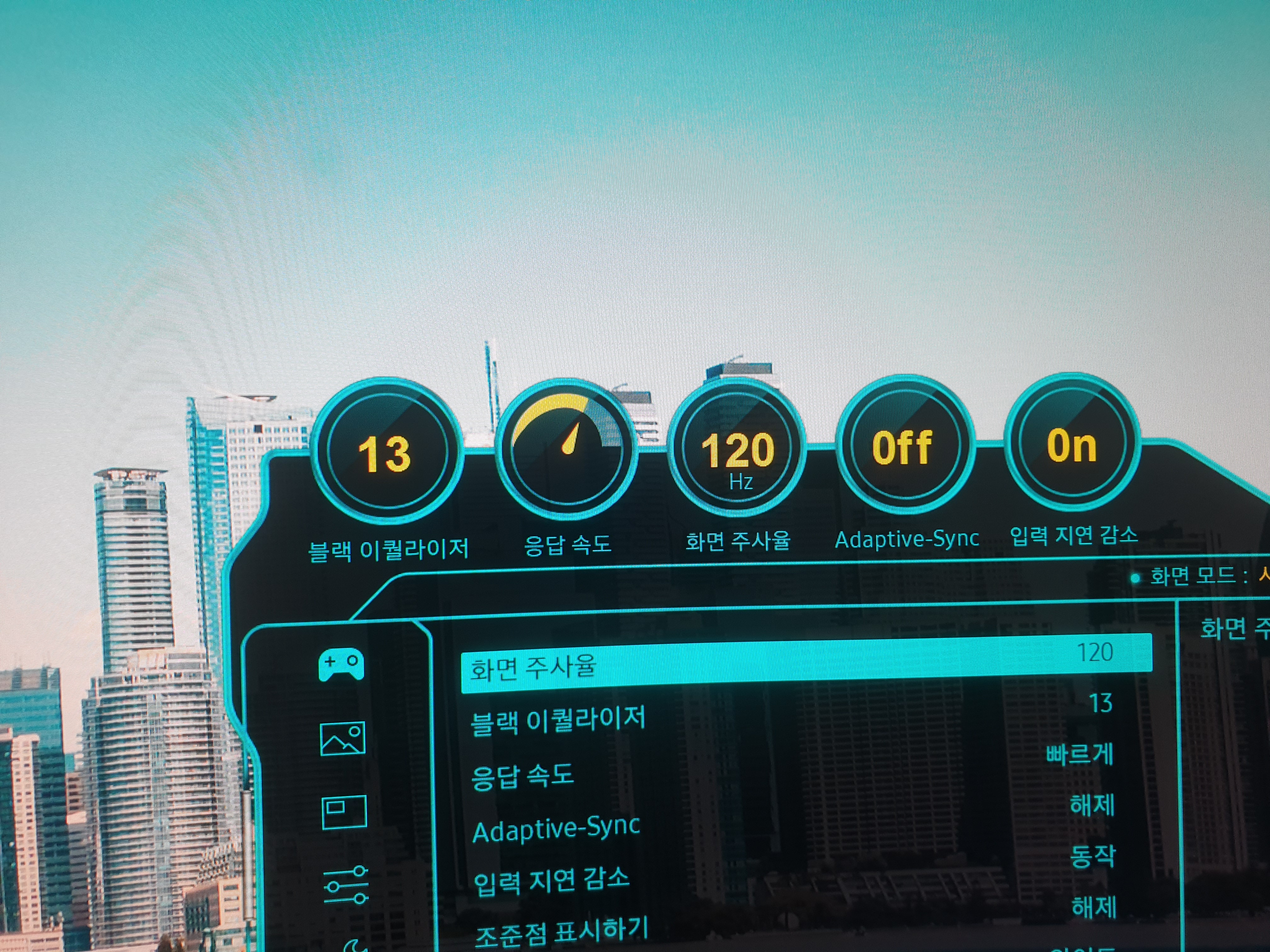 블랙 이퀼라이저 세팅, 응답속도 세팅, 화면 주사율 세팅, Adaptive-Sync세팅, 입력지연감소 세팅을 할 수 있다. 다른 세팅은 놔두고 화면 주사율부터 변경해본다. 태어나서 처음으로 60hz가 아닌 세팅으로 모니터를 사용해본다.