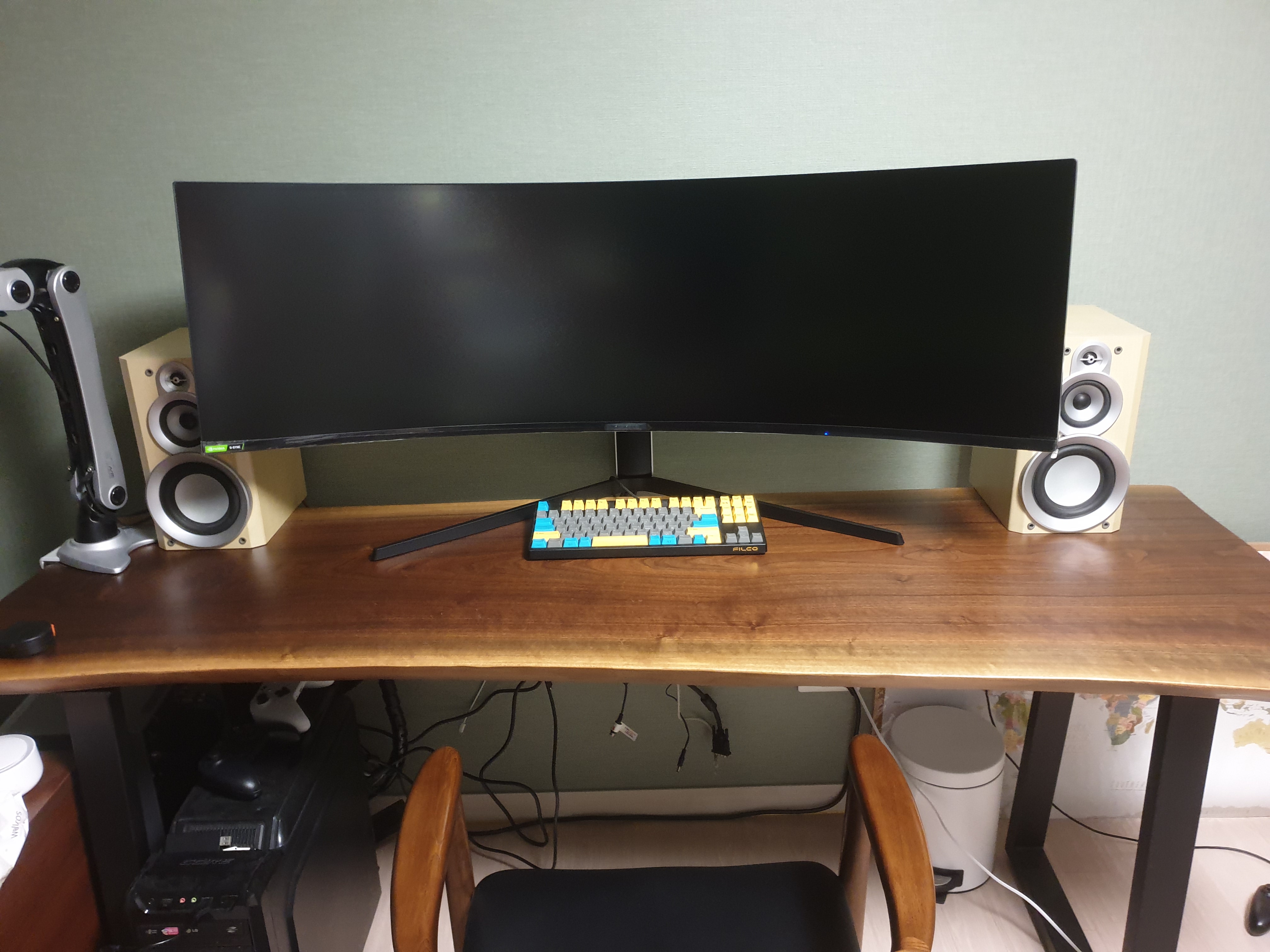이렇게 모니터가 우드슬랩에 놓인 모습. 엄청난 광활함이다. 하지만 높이가 높지는 않다.