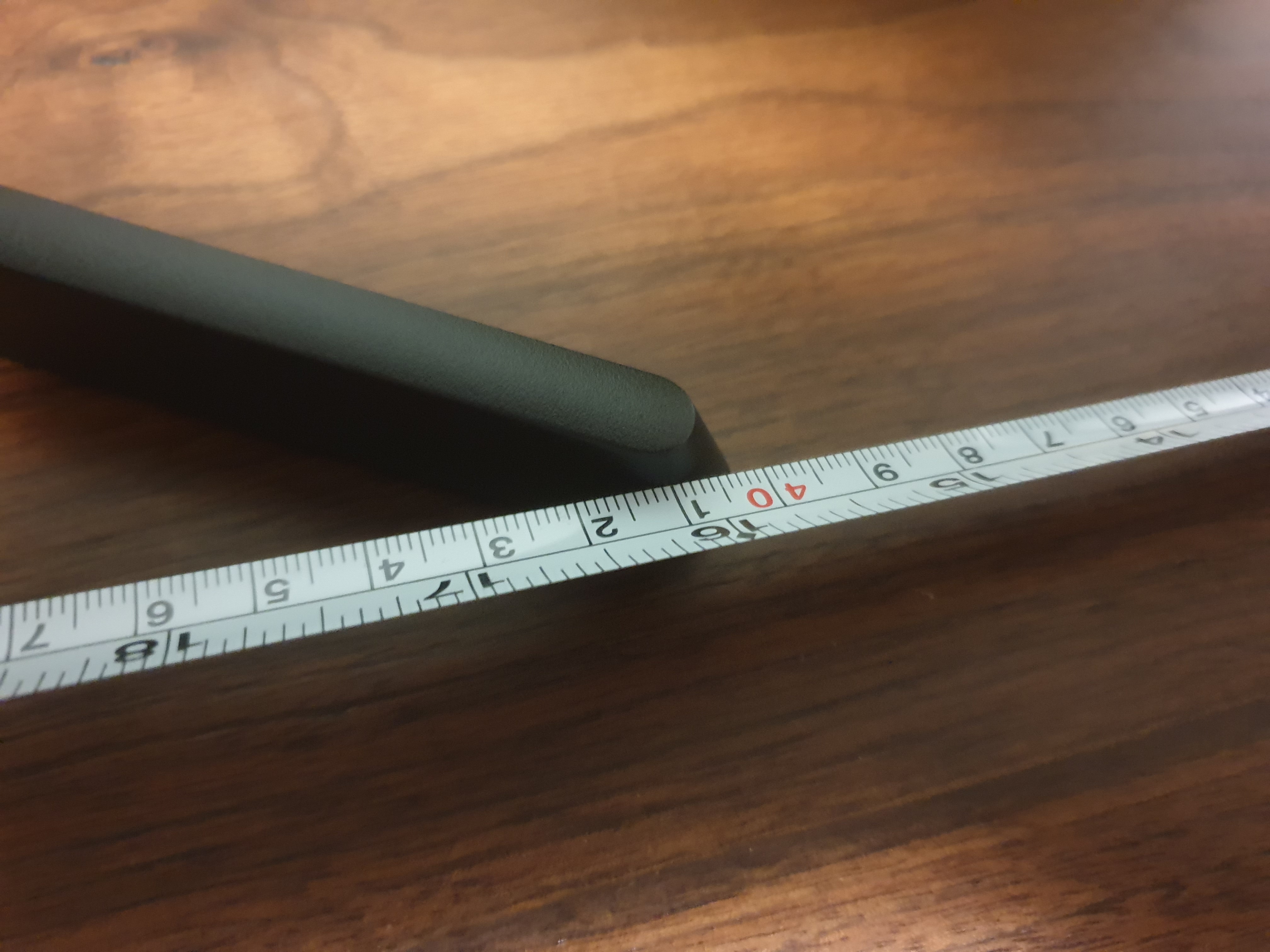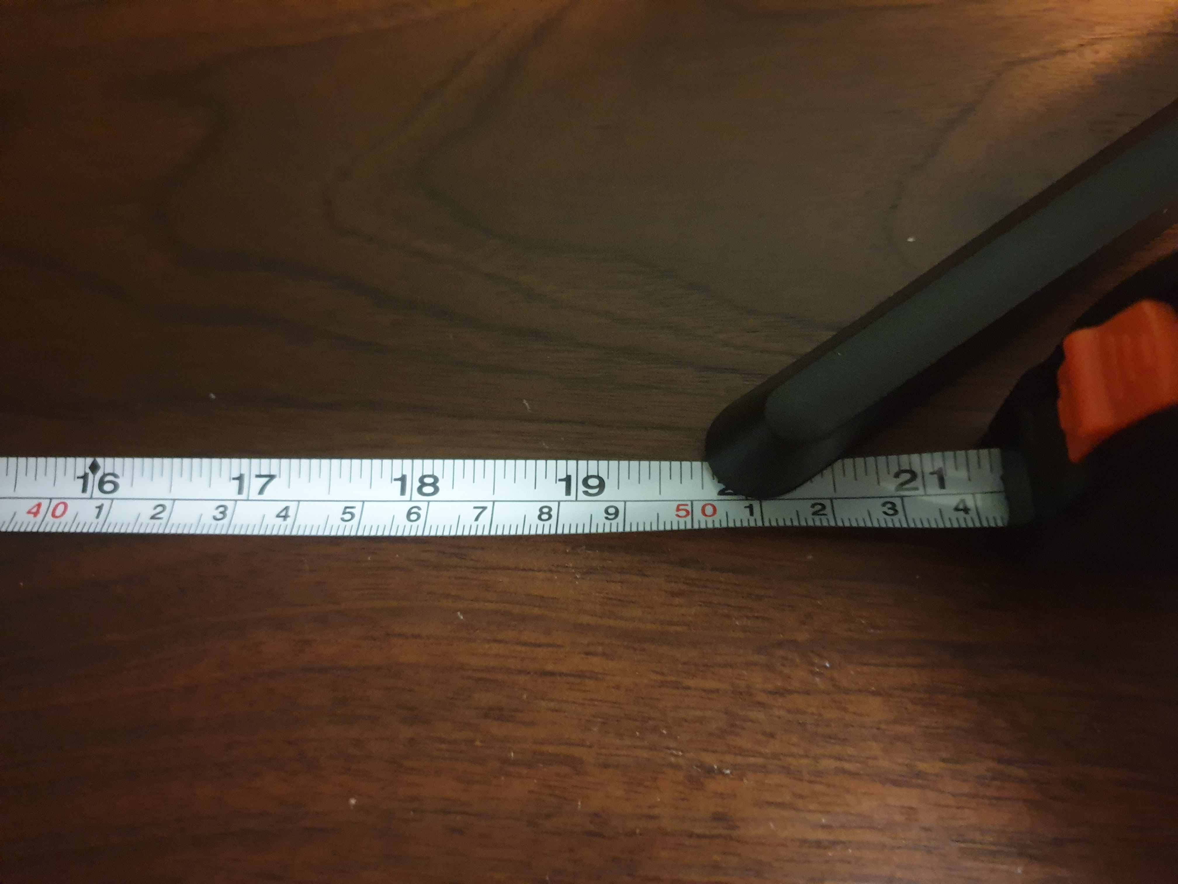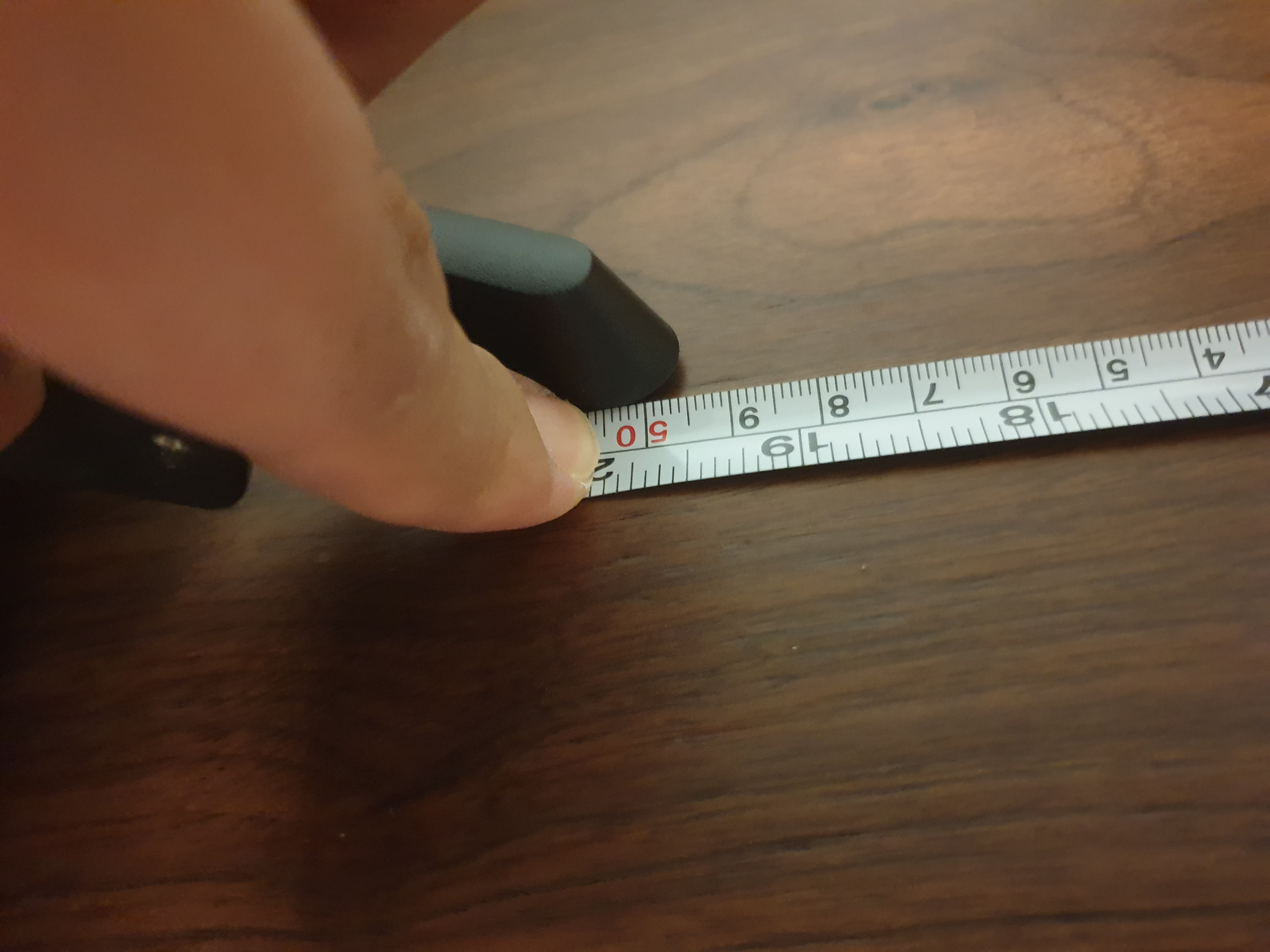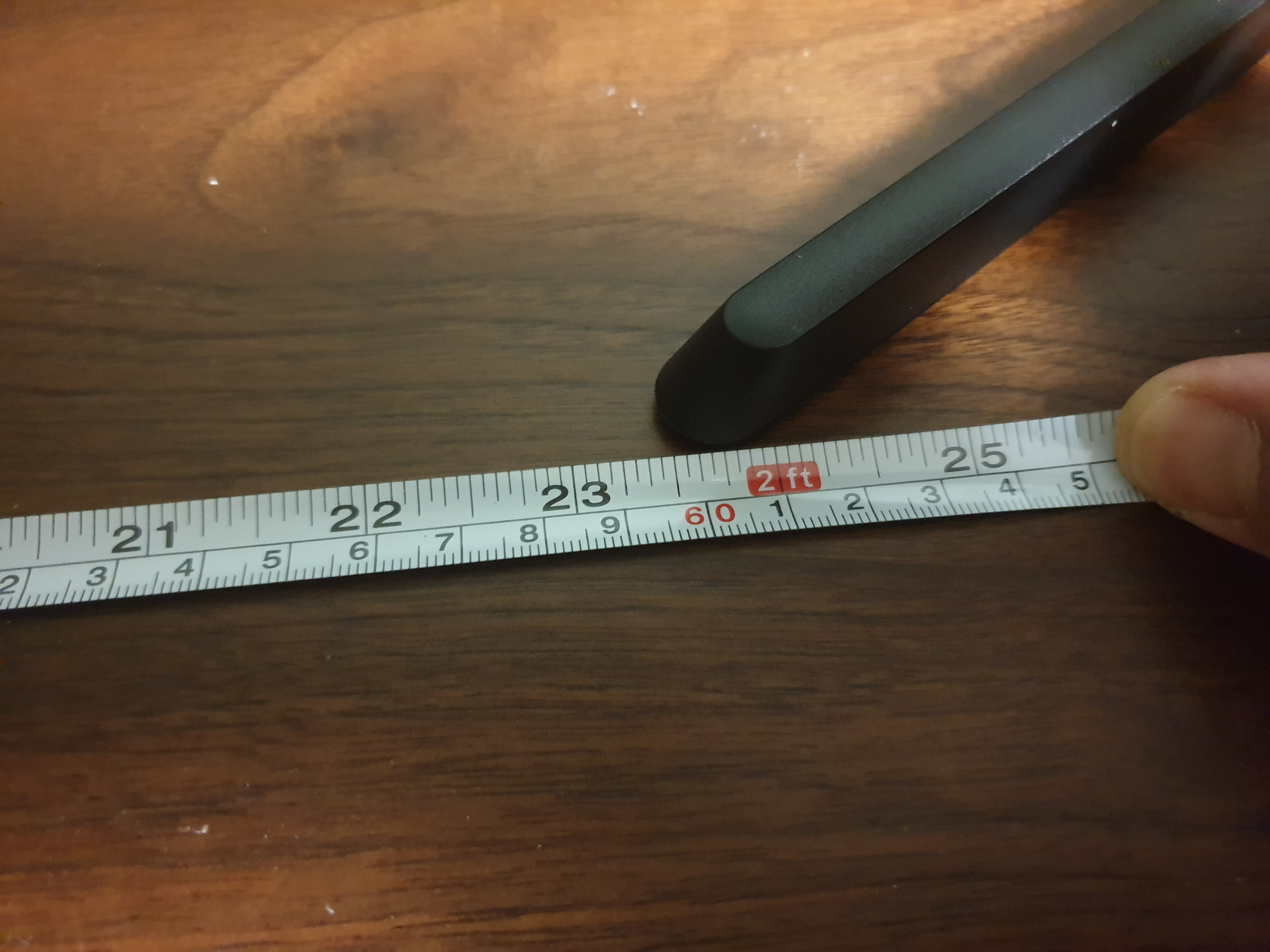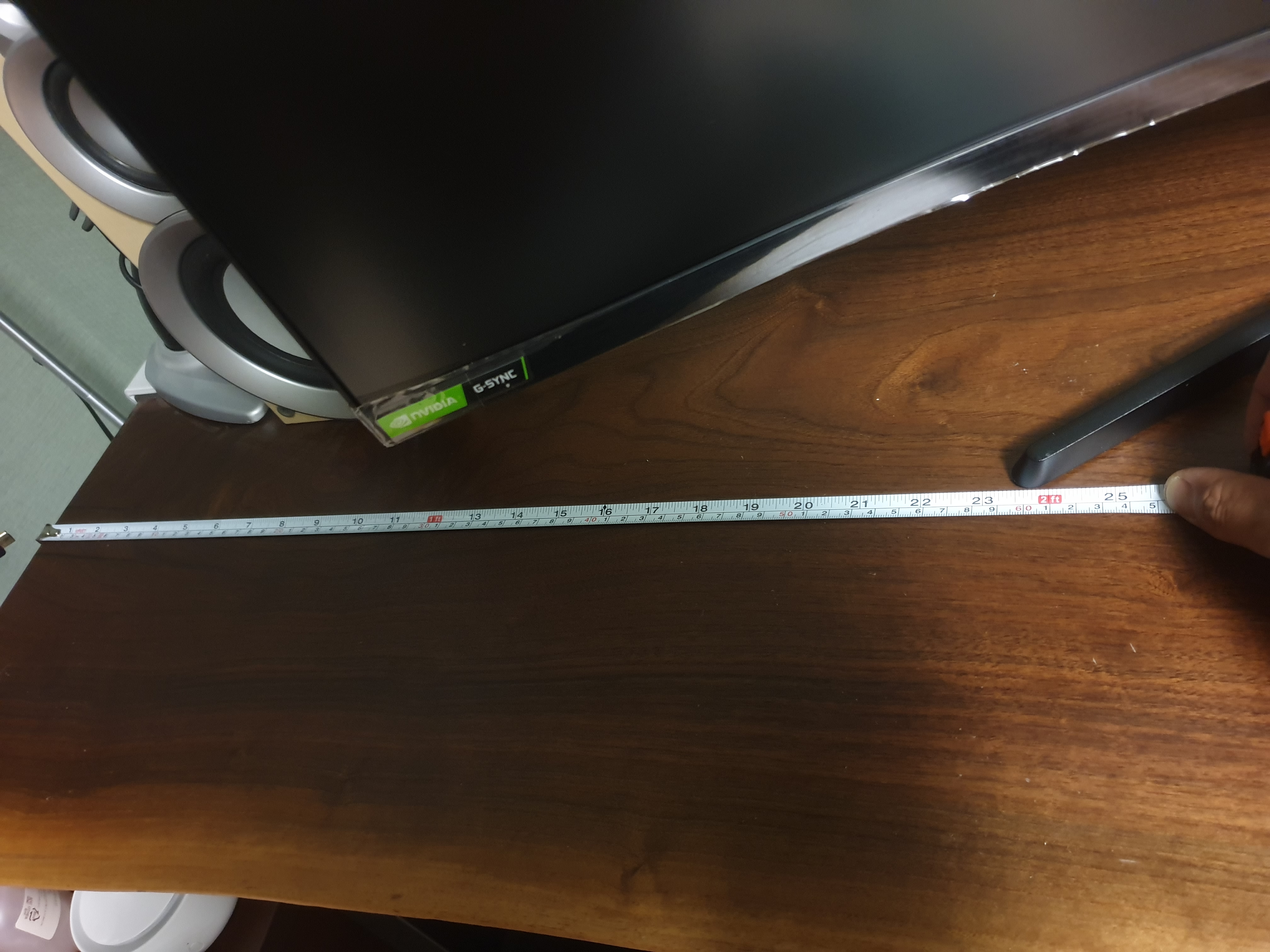모니터를 책상 가운데 놓기 위해 줄자로 우드슬랩의 한쪽끝부터 스탠드 다리까지의 길이를 측정한다.