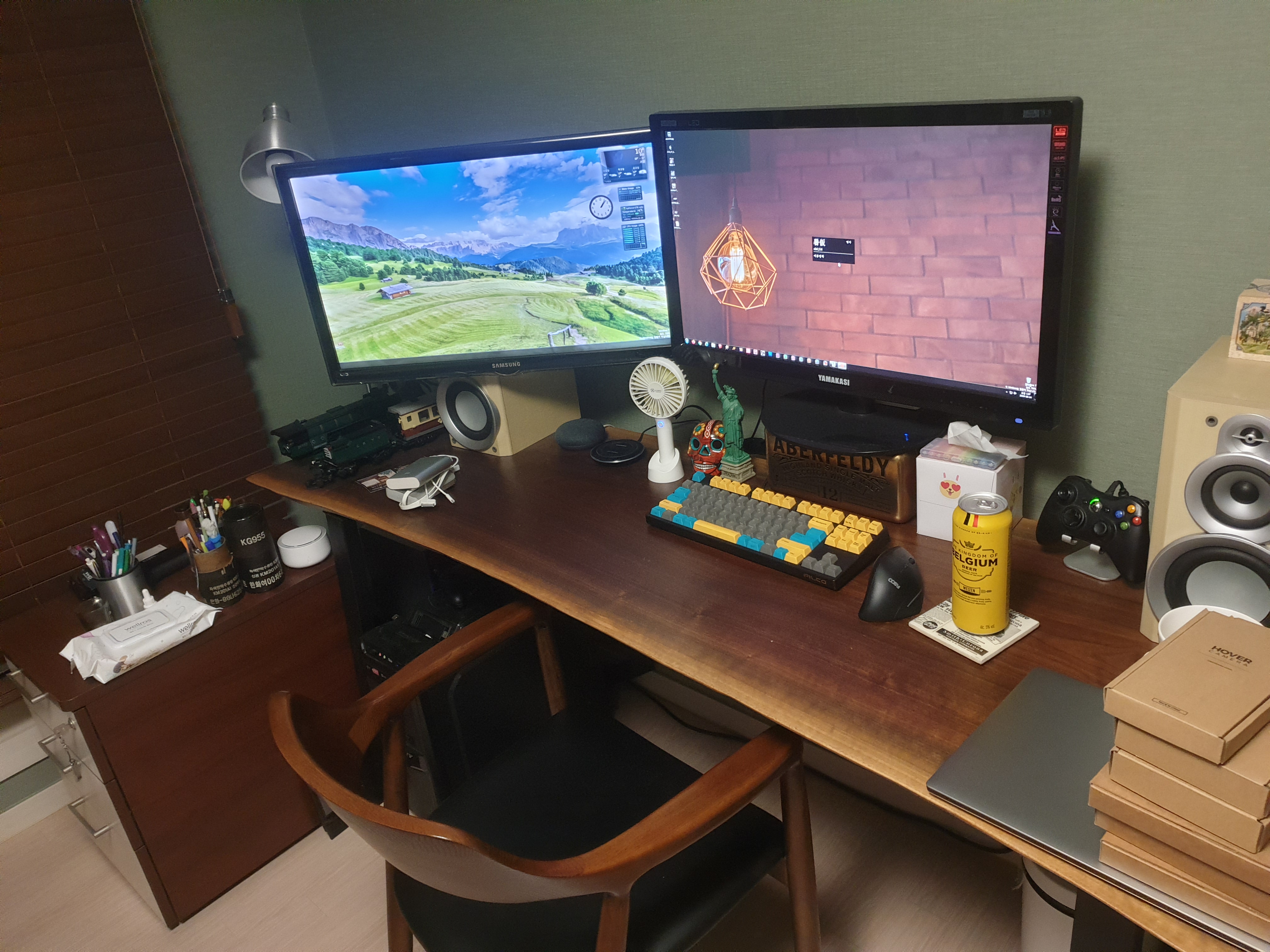 27인치 x2의 세팅. 삼성 1920x1080 FULL HD 모니터가 좌측에, 야마카시 2560x1440 QHD 모니터가 우측에 있던 세팅이다.
