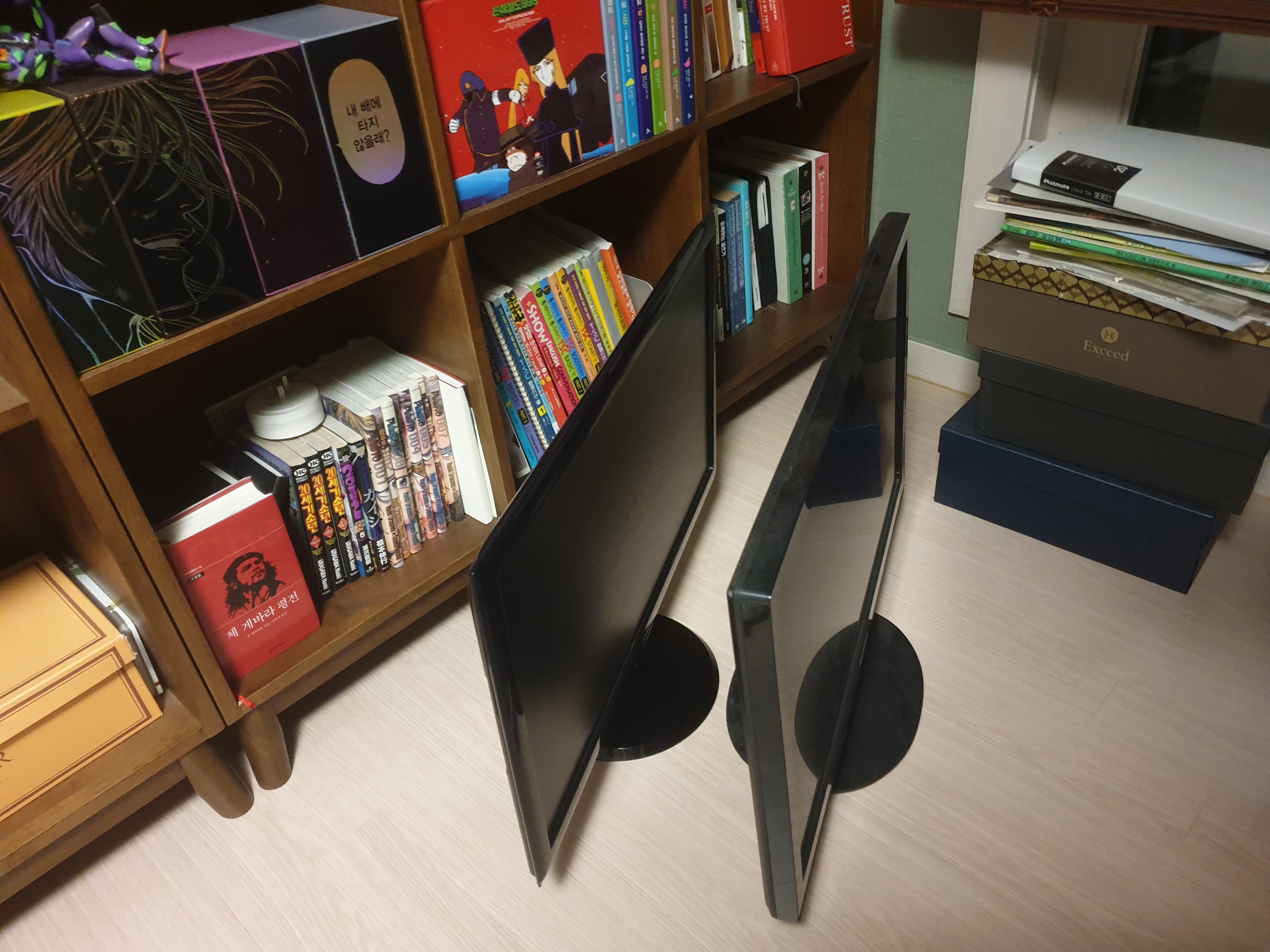 바닥에 내려놓는다. 이 두개의 모니터는 판매할 예정이다.