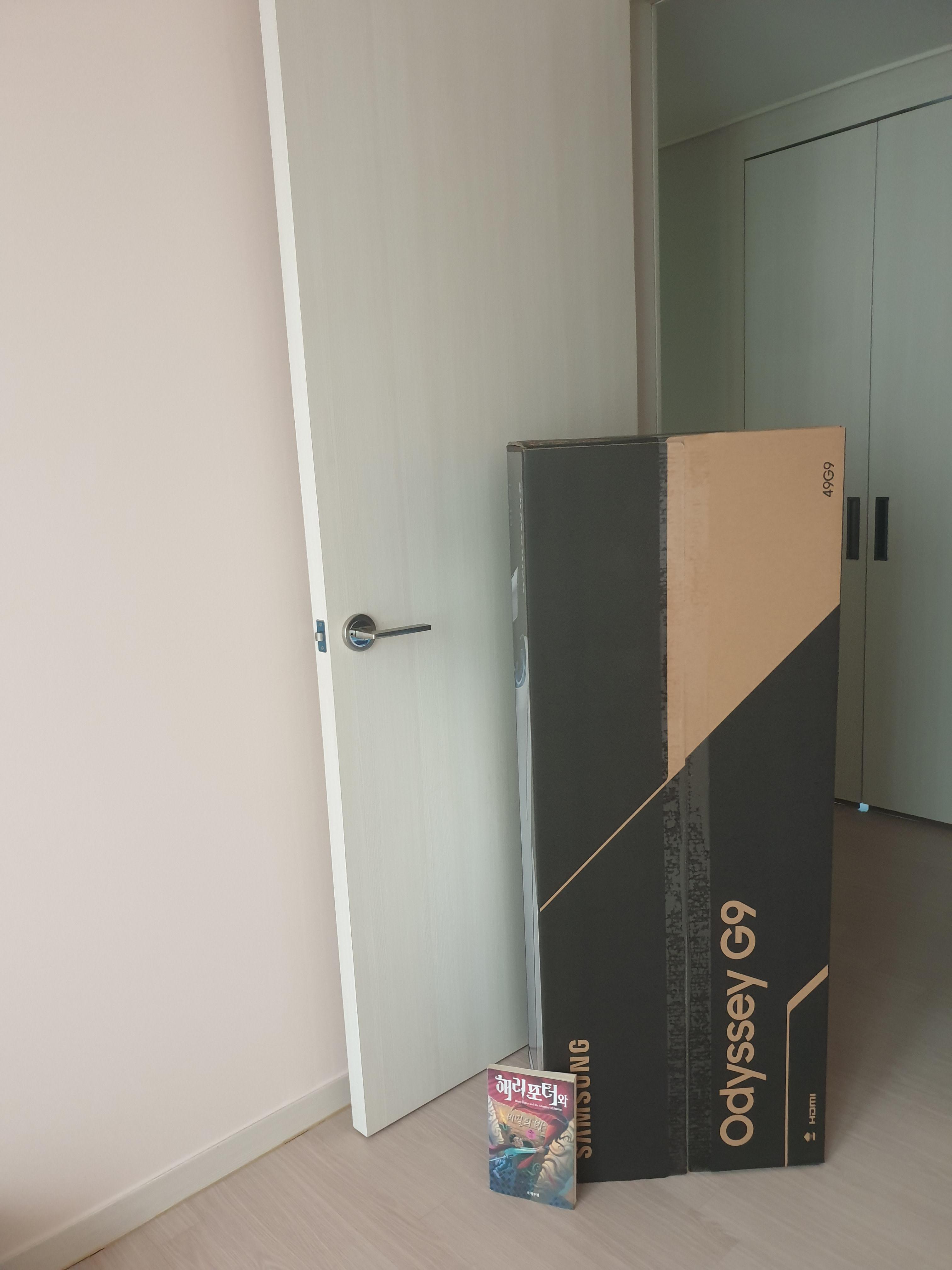 배송되어온 모니터 제품. 저기 같이 세워놓은 해리포터 도서 사이즈가 세로 21cm이다. 엄청나게 큰 박스의 사이즈가 설렘을 준다.