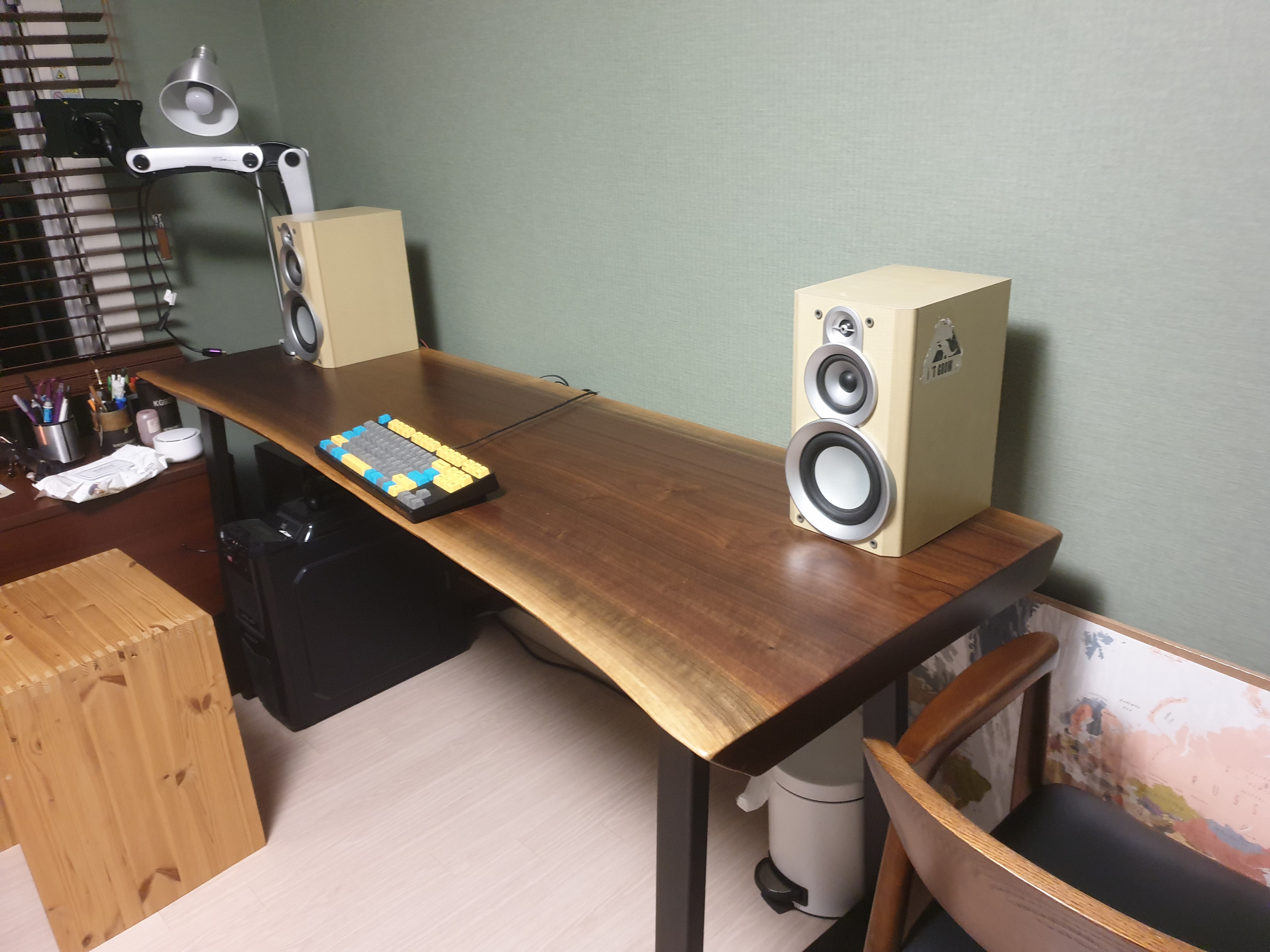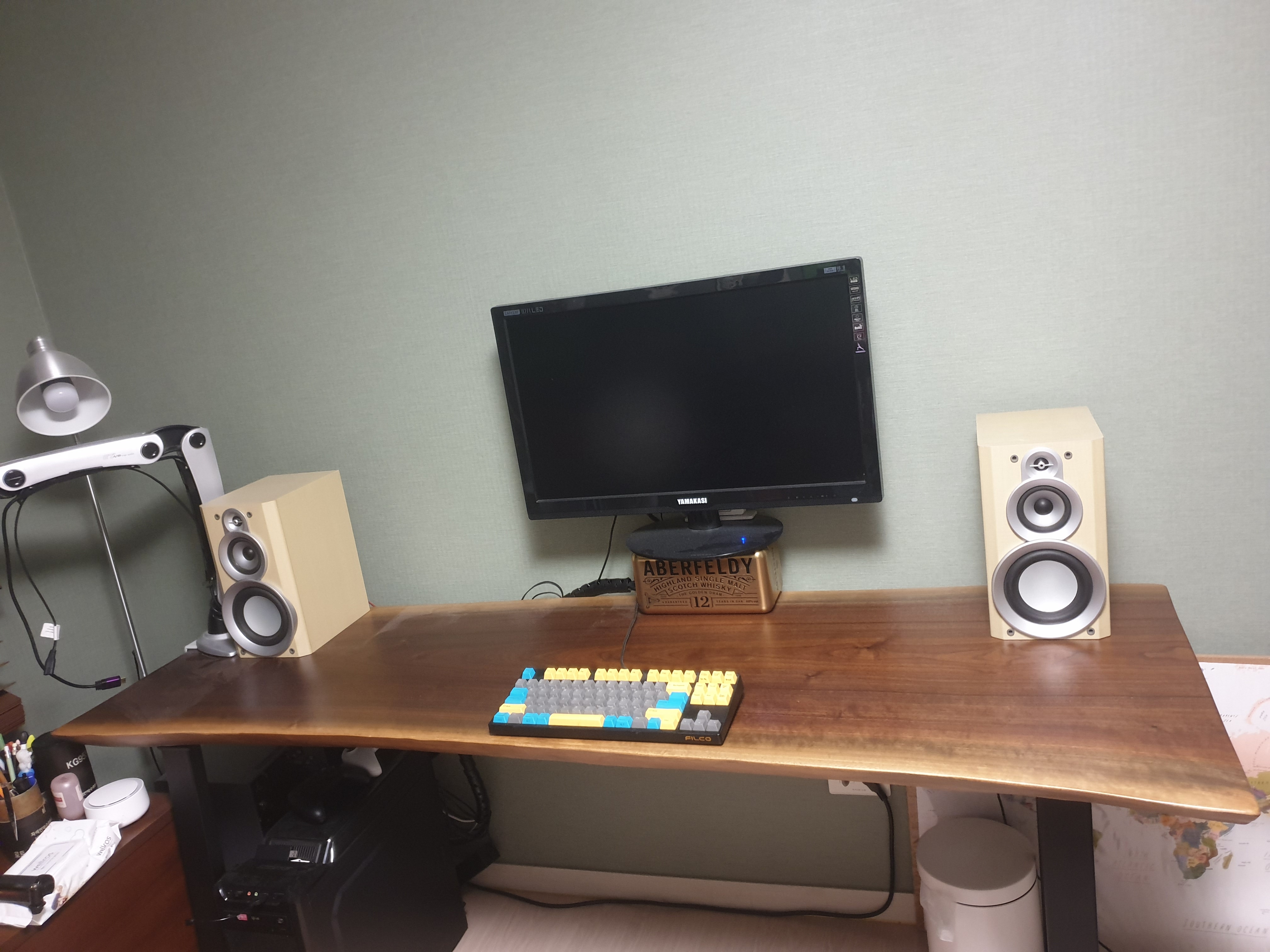 공중에서 내려다본 모습. 모니터암을 쓰지않고 스탠드를 그대로 활용하기 때문에 책상공간이 스탠드에 의해 침범된다. 그 피해를 최대한 적게보기 위해 벽면을 띄우고 스탠드를 후면에 바짝 붙인다.