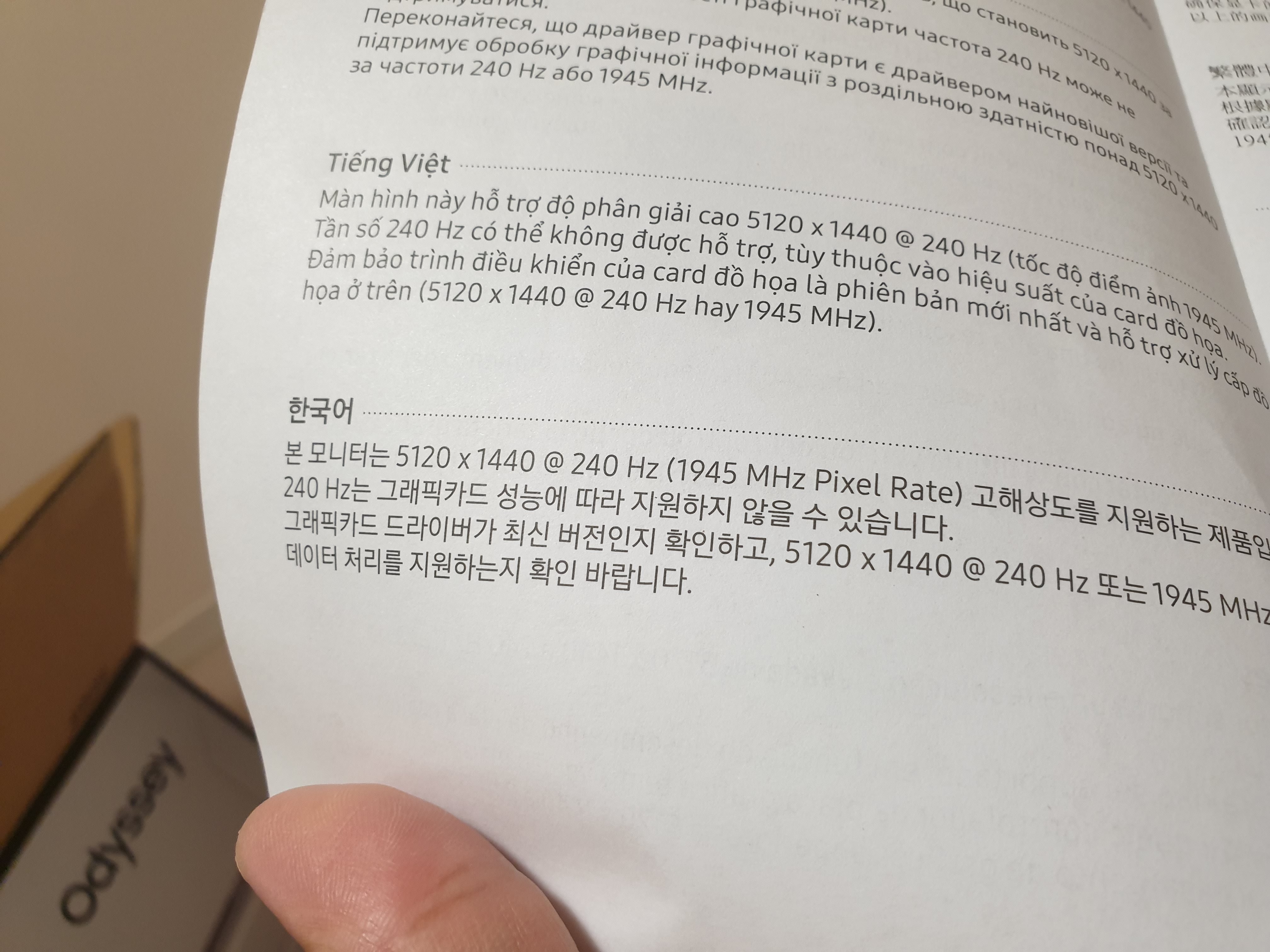 메뉴얼에 나와있는 제품 사양. 제품 자체는 240Hz 고주사율을 5120x1440 고해상도에서 제공하지만 그래픽카드의 성능에 따라 bottle neck이 걸릴 수 있다는 내요이다. 에디터가 알기로 현존하는 모든 그래픽 카드를 통틀어 5120x1440의 737만개의 화소를 1초에 240장 그려낼 수 있는 그래픽카드는 없다.