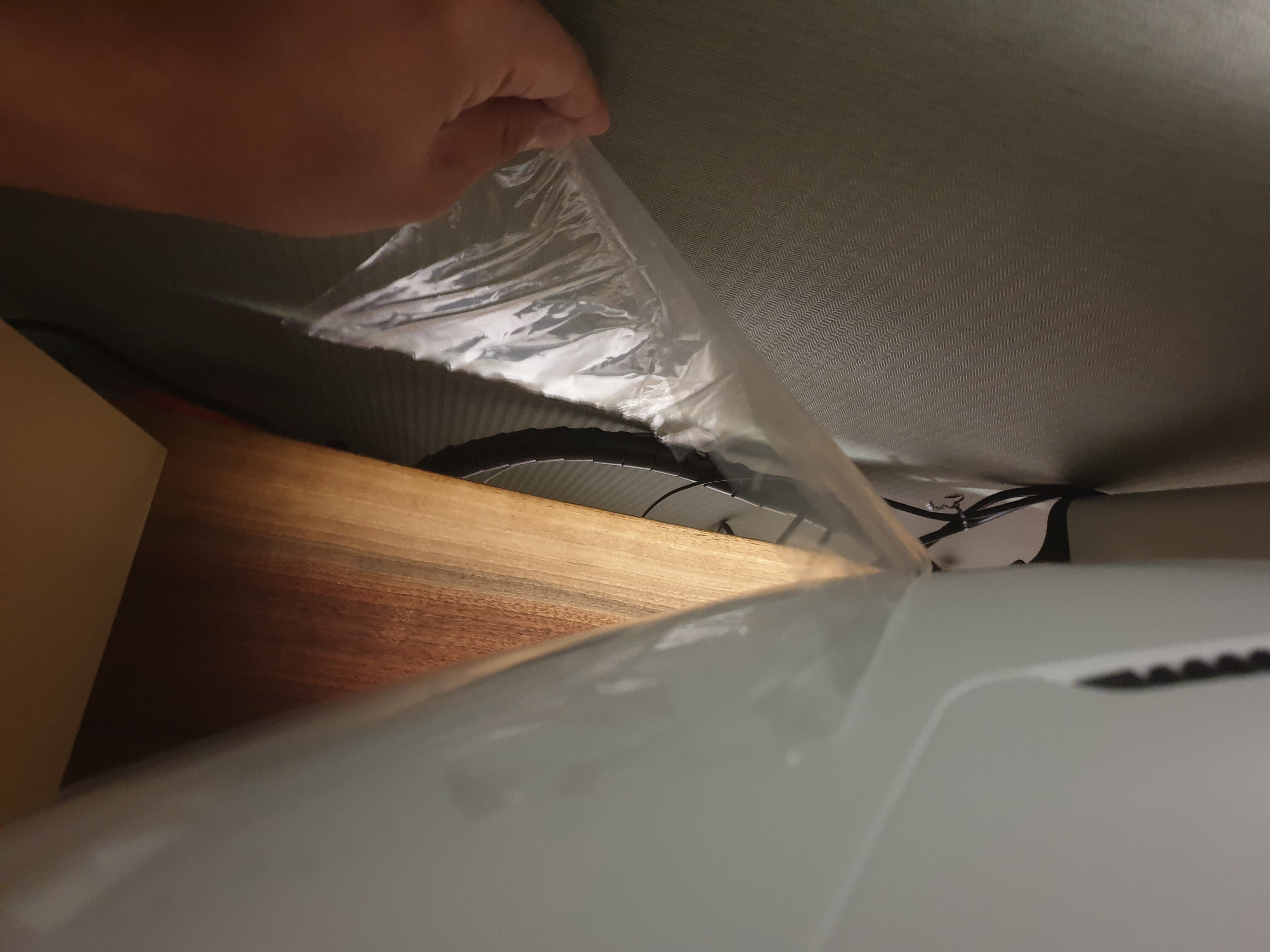 공중에서 내려다본 모습. 모니터암을 쓰지않고 스탠드를 그대로 활용하기 때문에 책상공간이 스탠드에 의해 침범된다. 그 피해를 최대한 적게보기 위해 벽면을 띄우고 스탠드를 후면에 바짝 붙인다.